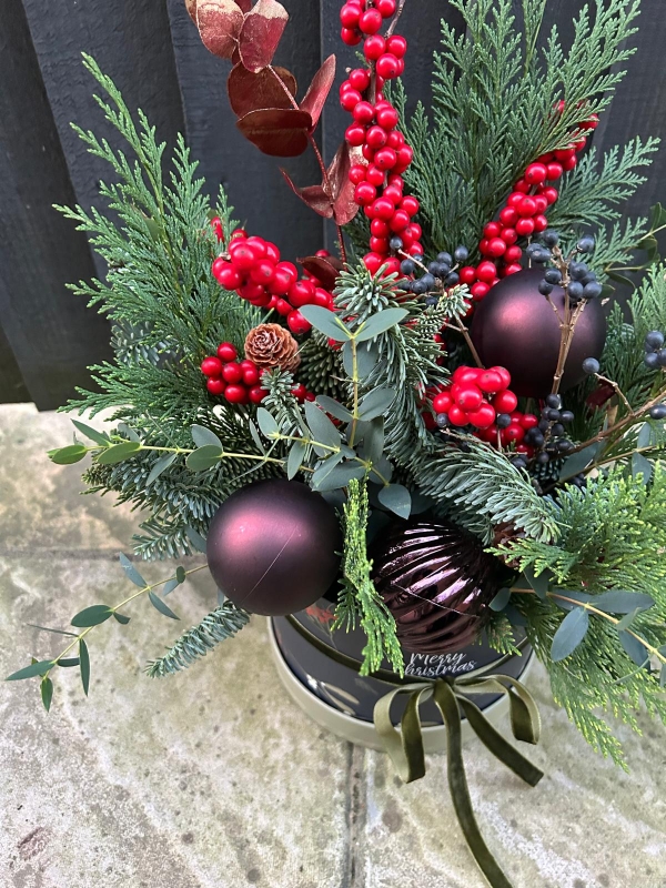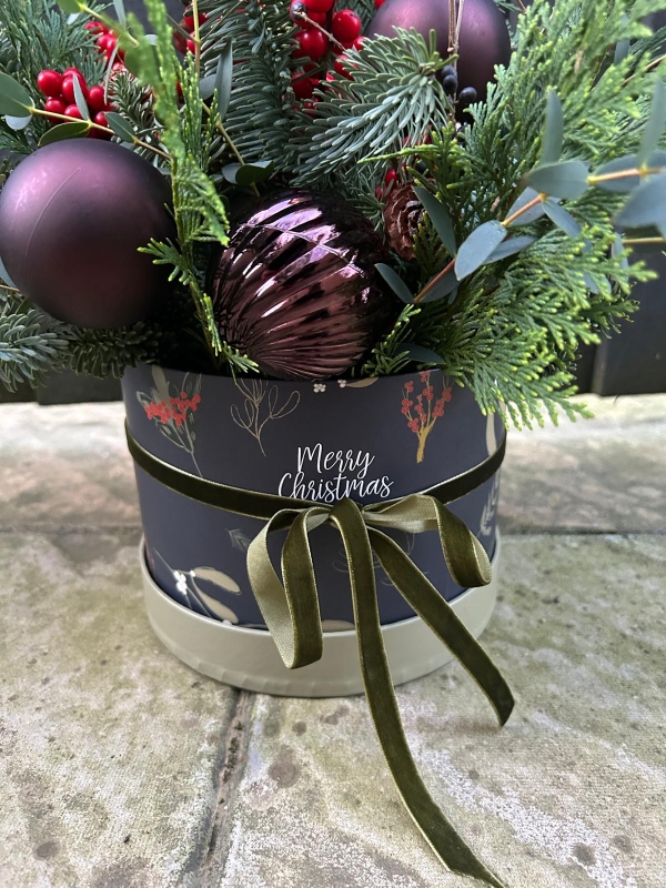 Hat Box Arrangement of mixed Christmas foliage. Expect gorgeous shades of plum and burgundy, red and green. Fragrant and unusual.